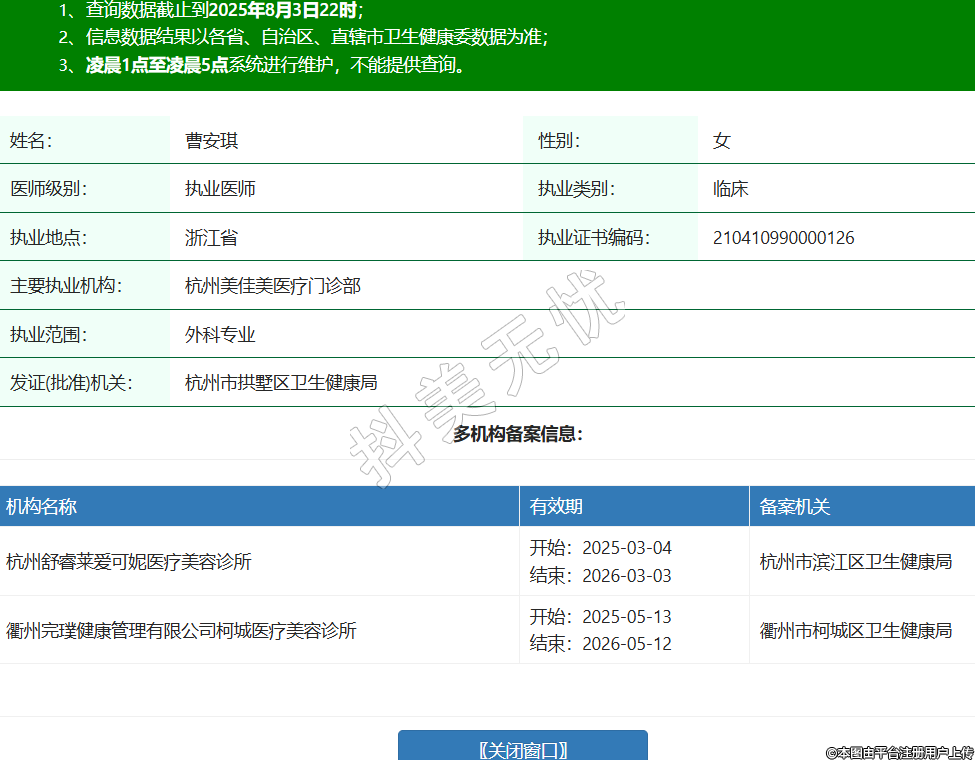 機(jī)構(gòu)名稱 有效期 備案機(jī)關(guān) 杭州舒睿萊愛可妮醫(yī)療美容診所 開始:2025-03-04結(jié)束:2026-03-03杭州市濱江區(qū)衛(wèi)生健康局 衢州完璞健康管理有限公司柯城醫(yī)療美容診所 開始:2025-05-13結(jié)束:2026-05-12衢州市柯城區(qū)衛(wèi)生健康局 -