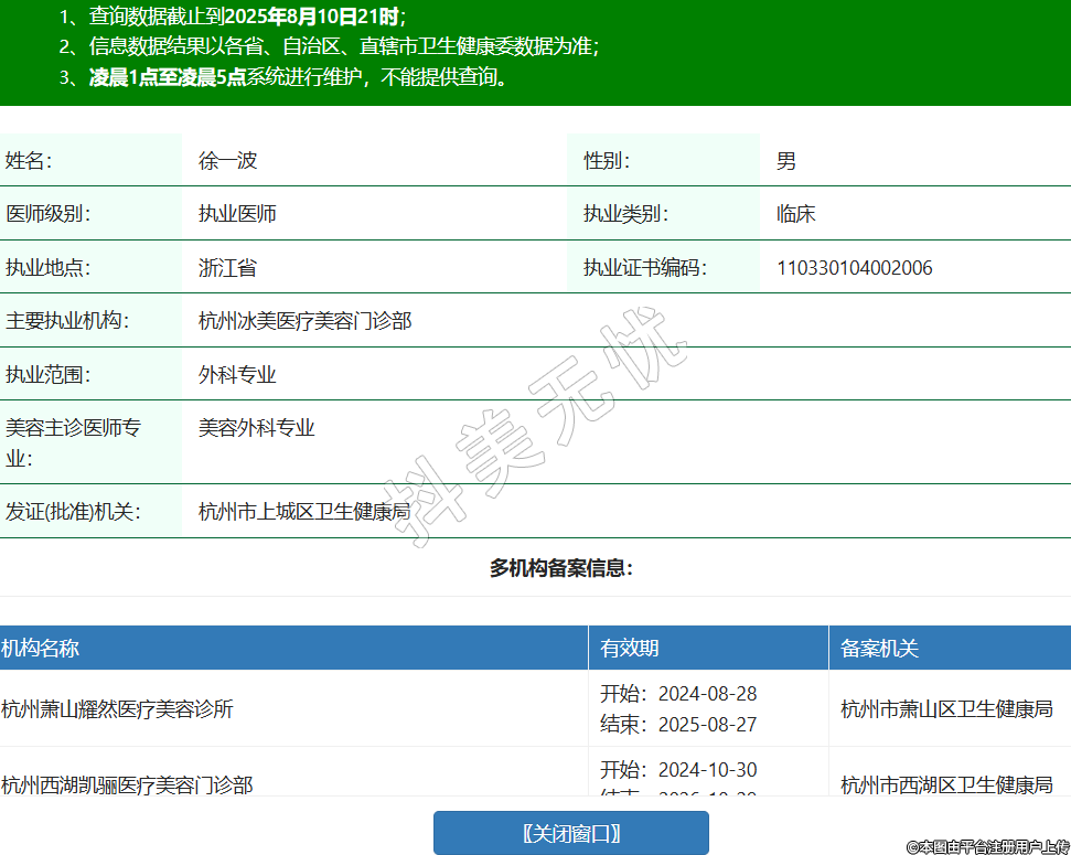 姓名:徐一波性別:男醫(yī)師級別:執(zhí)業(yè)醫(yī)師執(zhí)業(yè)類別:臨床執(zhí)業(yè)地點(diǎn):浙江省執(zhí)業(yè)證書編碼:110330104002006主要執(zhí)業(yè)機(jī)構(gòu):杭州冰美醫(yī)療美容門診部執(zhí)業(yè)范圍:外科專業(yè)美容主診醫(yī)師專業(yè):美容外科專業(yè)發(fā)證(批準(zhǔn))機(jī)關(guān):杭州市上城區(qū)衛(wèi)生健康局多機(jī)構(gòu)備案信息: