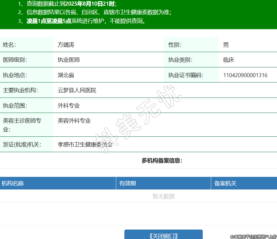 姓名:方靖濤性別:男醫(yī)師級(jí)別:執(zhí)業(yè)醫(yī)師執(zhí)業(yè)類別:臨床執(zhí)業(yè)地點(diǎn):湖北省執(zhí)業(yè)證書編碼:110420900001316主要執(zhí)業(yè)機(jī)構(gòu):云夢(mèng)縣人民醫(yī)院執(zhí)業(yè)范圍:外科專業(yè)美容主診醫(yī)師專業(yè):美容外科專業(yè)發(fā)證(批準(zhǔn))機(jī)關(guān):孝感市衛(wèi)生健康委員會(huì)