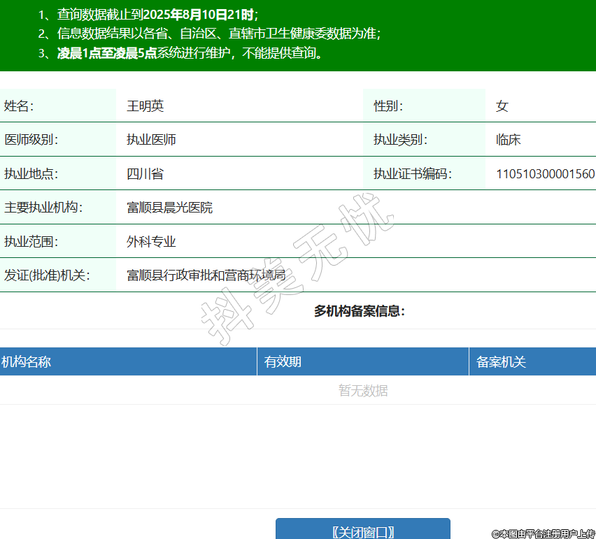 姓名:王明英性別:女醫(yī)師級別:執(zhí)業(yè)醫(yī)師執(zhí)業(yè)類別:臨床執(zhí)業(yè)地點:四川省執(zhí)業(yè)證書編碼:110510300001560主要執(zhí)業(yè)機構(gòu):富順縣晨光醫(yī)院執(zhí)業(yè)范圍:外科專業(yè)發(fā)證(批準)機關(guān):富順縣行政審批和營商環(huán)境局