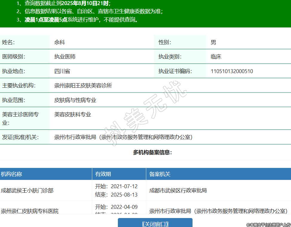 機構(gòu)名稱 有效期 備案機關(guān) 成都武侯王小膚門診部 開始:2021-07-12結(jié)束:2025-08-13成都市武侯區(qū)行政審批局 崇州崇仁皮膚病??漆t(yī)院 開始:2022-04-09結(jié)束:2026-04-08崇州市行政審批局(崇州市政務(wù)服務(wù)管理和網(wǎng)絡(luò)理政辦公室) 崇州謝雪冰皮膚診所 開始:2023-10-21結(jié)束:2026-10-20崇州市行政審批局(崇州市政務(wù)服務(wù)管理和網(wǎng)絡(luò)理政辦公室) 崇州崇仁醫(yī)院 開始:2024-02-01結(jié)束:2029-01-30崇州市行政審批局(崇州市政務(wù)服務(wù)管理和網(wǎng)絡(luò)理政辦公室) 崇州崇陽漢密爾頓醫(yī)學(xué)美容門診部 開始:2025-06-10結(jié)束:2026-06-09崇州市行政審批局(崇州市政務(wù)服務(wù)管理和網(wǎng)絡(luò)理政辦公室) -
