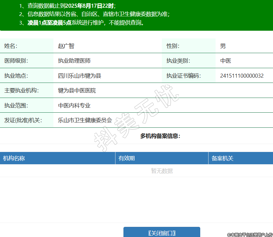 姓名:趙廣智性別:男醫(yī)師級(jí)別:執(zhí)業(yè)助理醫(yī)師執(zhí)業(yè)類(lèi)別:中醫(yī)執(zhí)業(yè)地點(diǎn):四川樂(lè)山市犍為縣執(zhí)業(yè)證書(shū)編碼:241511100000032主要執(zhí)業(yè)機(jī)構(gòu):犍為縣中醫(yī)醫(yī)院執(zhí)業(yè)范圍:中醫(yī)內(nèi)科專(zhuān)業(yè)發(fā)證(批準(zhǔn))機(jī)關(guān):樂(lè)山市衛(wèi)生健康委員會(huì)