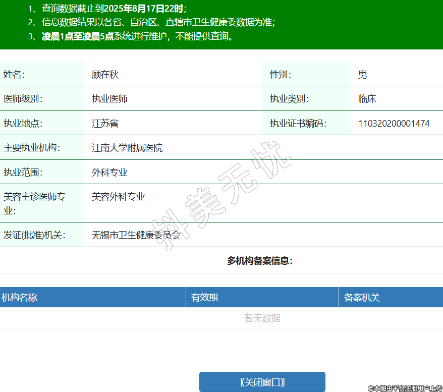 姓名:顧在秋性別:男醫(yī)師級(jí)別:執(zhí)業(yè)醫(yī)師執(zhí)業(yè)類別:臨床執(zhí)業(yè)地點(diǎn):江蘇省執(zhí)業(yè)證書編碼:110320200001474主要執(zhí)業(yè)機(jī)構(gòu):江南大學(xué)附屬醫(yī)院執(zhí)業(yè)范圍:外科專業(yè)美容主診醫(yī)師專業(yè):美容外科專業(yè)發(fā)證(批準(zhǔn))機(jī)關(guān):無錫市衛(wèi)生健康委員會(huì)