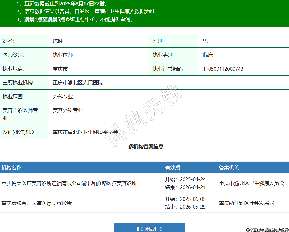 機(jī)構(gòu)名稱 有效期 備案機(jī)關(guān) 重慶悅?cè)R醫(yī)療美容診所連鎖有限公司渝北和雅路醫(yī)療美容診所 開始:2025-04-24結(jié)束:2026-04-21重慶市渝北區(qū)衛(wèi)生健康委員會(huì) 重慶漾膚金開大道醫(yī)療美容診所 開始:2025-06-05結(jié)束:2026-05-29重慶兩江新區(qū)社會(huì)發(fā)展局 -