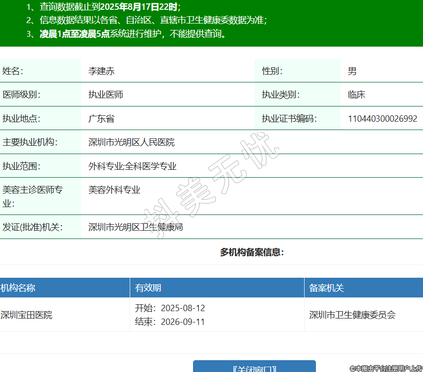 姓名:李建赤性別:男醫(yī)師級別:執(zhí)業(yè)醫(yī)師執(zhí)業(yè)類別:臨床執(zhí)業(yè)地點:廣東省執(zhí)業(yè)證書編碼:110440300026992主要執(zhí)業(yè)機構:深圳市光明區(qū)人民醫(yī)院執(zhí)業(yè)范圍:外科專業(yè);全科醫(yī)學專業(yè)美容主診醫(yī)師專業(yè):美容外科專業(yè)發(fā)證(批準)機關:深圳市光明區(qū)衛(wèi)生健康局多機構備案信息: