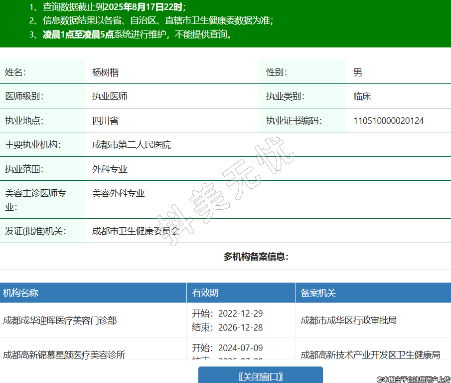 姓名:楊樹楷性別:男醫(yī)師級別:執(zhí)業(yè)醫(yī)師執(zhí)業(yè)類別:臨床執(zhí)業(yè)地點(diǎn):四川省執(zhí)業(yè)證書編碼:110510000020124主要執(zhí)業(yè)機(jī)構(gòu):成都市第二人民醫(yī)院執(zhí)業(yè)范圍:外科專業(yè)美容主診醫(yī)師專業(yè):美容外科專業(yè)發(fā)證(批準(zhǔn))機(jī)關(guān):成都市衛(wèi)生健康委員會多機(jī)構(gòu)備案信息: