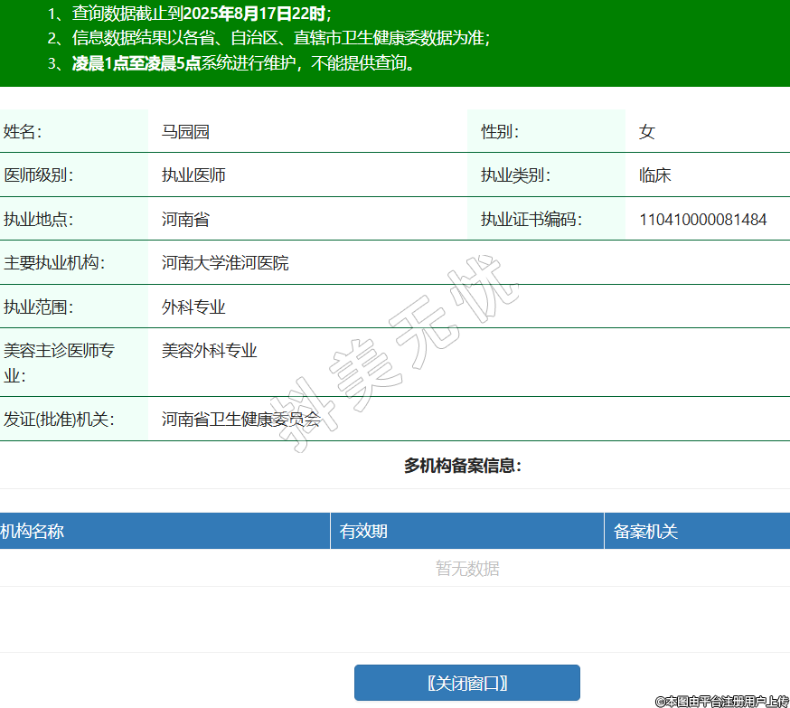 姓名:馬園園性別:女醫(yī)師級別:執(zhí)業(yè)醫(yī)師執(zhí)業(yè)類別:臨床執(zhí)業(yè)地點(diǎn):河南省執(zhí)業(yè)證書編碼:110410000081484主要執(zhí)業(yè)機(jī)構(gòu):河南大學(xué)淮河醫(yī)院執(zhí)業(yè)范圍:外科專業(yè)美容主診醫(yī)師專業(yè):美容外科專業(yè)發(fā)證(批準(zhǔn))機(jī)關(guān):河南省衛(wèi)生健康委員會