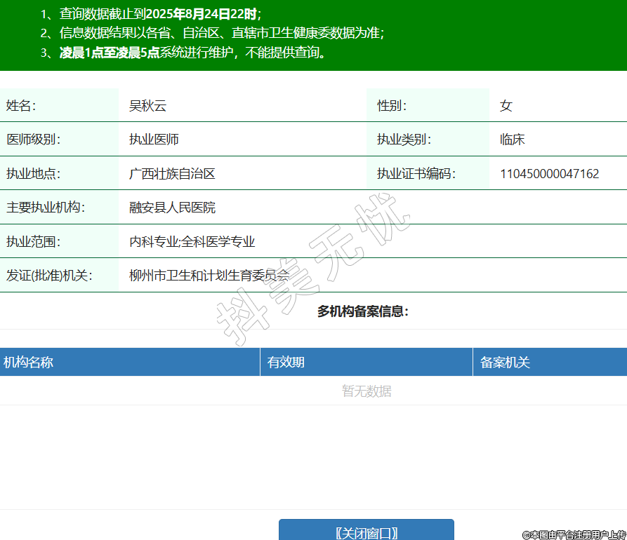 姓名:吳秋云性別:女醫(yī)師級別:執(zhí)業(yè)醫(yī)師執(zhí)業(yè)類別:臨床執(zhí)業(yè)地點(diǎn):廣西壯族自治區(qū)執(zhí)業(yè)證書編碼:110450000047162主要執(zhí)業(yè)機(jī)構(gòu):融安縣人民醫(yī)院執(zhí)業(yè)范圍:內(nèi)科專業(yè);全科醫(yī)學(xué)專業(yè)發(fā)證(批準(zhǔn))機(jī)關(guān):柳州市衛(wèi)生和計劃生育委員會