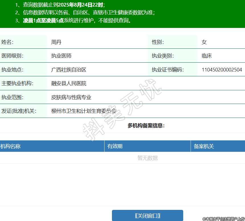 姓名:周丹性別:女醫(yī)師級(jí)別:執(zhí)業(yè)醫(yī)師執(zhí)業(yè)類(lèi)別:臨床執(zhí)業(yè)地點(diǎn):廣西壯族自治區(qū)執(zhí)業(yè)證書(shū)編碼:110450200002504主要執(zhí)業(yè)機(jī)構(gòu):融安縣人民醫(yī)院執(zhí)業(yè)范圍:皮膚病與性病專(zhuān)業(yè)發(fā)證(批準(zhǔn))機(jī)關(guān):柳州市衛(wèi)生和計(jì)劃生育委員會(huì)