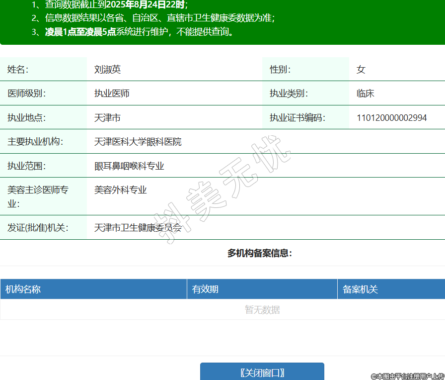 姓名:劉淑英性別:女醫(yī)師級別:執(zhí)業(yè)醫(yī)師執(zhí)業(yè)類別:臨床執(zhí)業(yè)地點(diǎn):天津市執(zhí)業(yè)證書編碼:110120000002994主要執(zhí)業(yè)機(jī)構(gòu):天津醫(yī)科大學(xué)眼科醫(yī)院執(zhí)業(yè)范圍:眼耳鼻咽喉科專業(yè)美容主診醫(yī)師專業(yè):美容外科專業(yè)發(fā)證(批準(zhǔn))機(jī)關(guān):天津市衛(wèi)生健康委員會