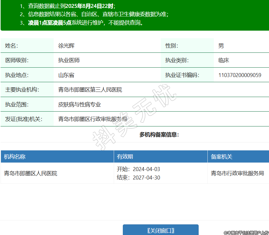 姓名:徐光輝性別:男醫(yī)師級(jí)別:執(zhí)業(yè)醫(yī)師執(zhí)業(yè)類別:臨床執(zhí)業(yè)地點(diǎn):山東省執(zhí)業(yè)證書編碼:110370200009059主要執(zhí)業(yè)機(jī)構(gòu):青島市即墨區(qū)第三人民醫(yī)院執(zhí)業(yè)范圍:皮膚病與性病專業(yè)發(fā)證(批準(zhǔn))機(jī)關(guān):青島市即墨區(qū)行政審批服務(wù)局多機(jī)構(gòu)備案信息: