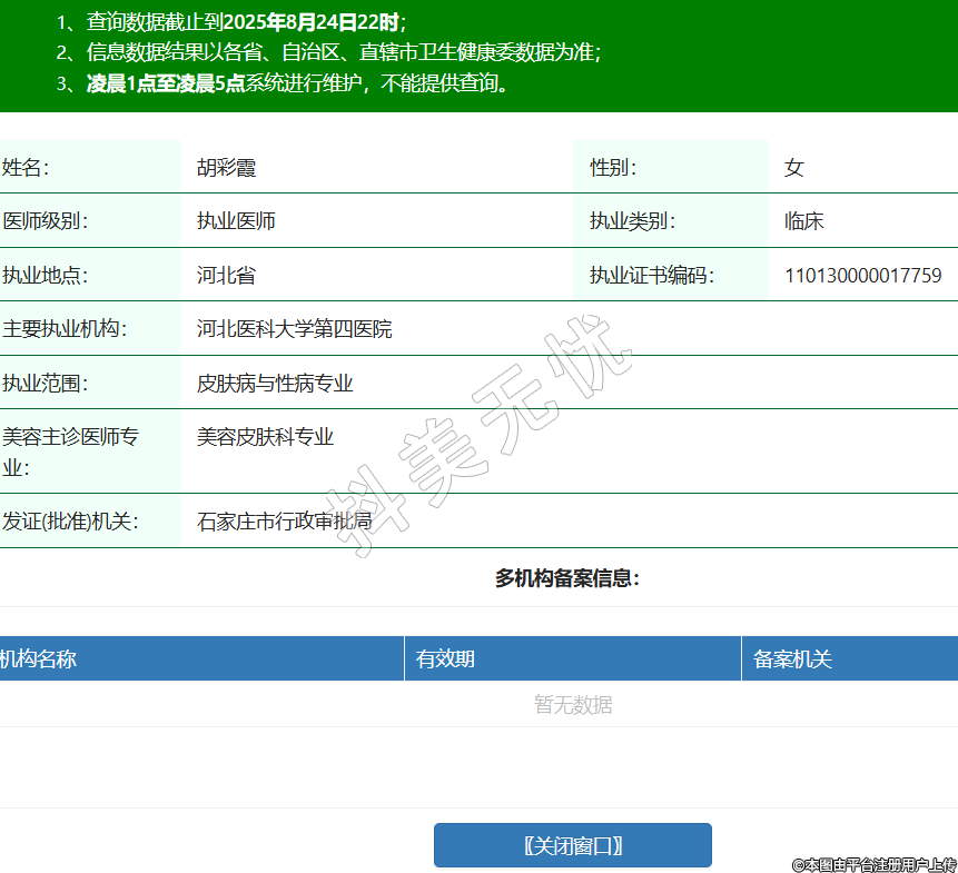 姓名:胡彩霞性別:女醫(yī)師級別:執(zhí)業(yè)醫(yī)師執(zhí)業(yè)類別:臨床執(zhí)業(yè)地點:河北省執(zhí)業(yè)證書編碼:110130000017759主要執(zhí)業(yè)機構(gòu):河北醫(yī)科大學(xué)第四醫(yī)院執(zhí)業(yè)范圍:皮膚病與性病專業(yè)美容主診醫(yī)師專業(yè):美容皮膚科專業(yè)發(fā)證(批準(zhǔn))機關(guān):石家莊市行政審批局