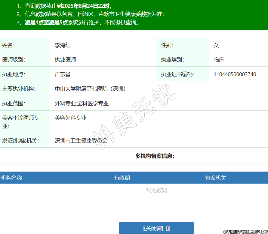 姓名:李海紅性別:女醫(yī)師級別:執(zhí)業(yè)醫(yī)師執(zhí)業(yè)類別:臨床執(zhí)業(yè)地點:廣東省執(zhí)業(yè)證書編碼:110440500003740主要執(zhí)業(yè)機構(gòu):中山大學(xué)附屬第七醫(yī)院(深圳)執(zhí)業(yè)范圍:外科專業(yè);全科醫(yī)學(xué)專業(yè)美容主診醫(yī)師專業(yè):美容外科專業(yè)發(fā)證(批準(zhǔn))機關(guān):深圳市衛(wèi)生健康委員會