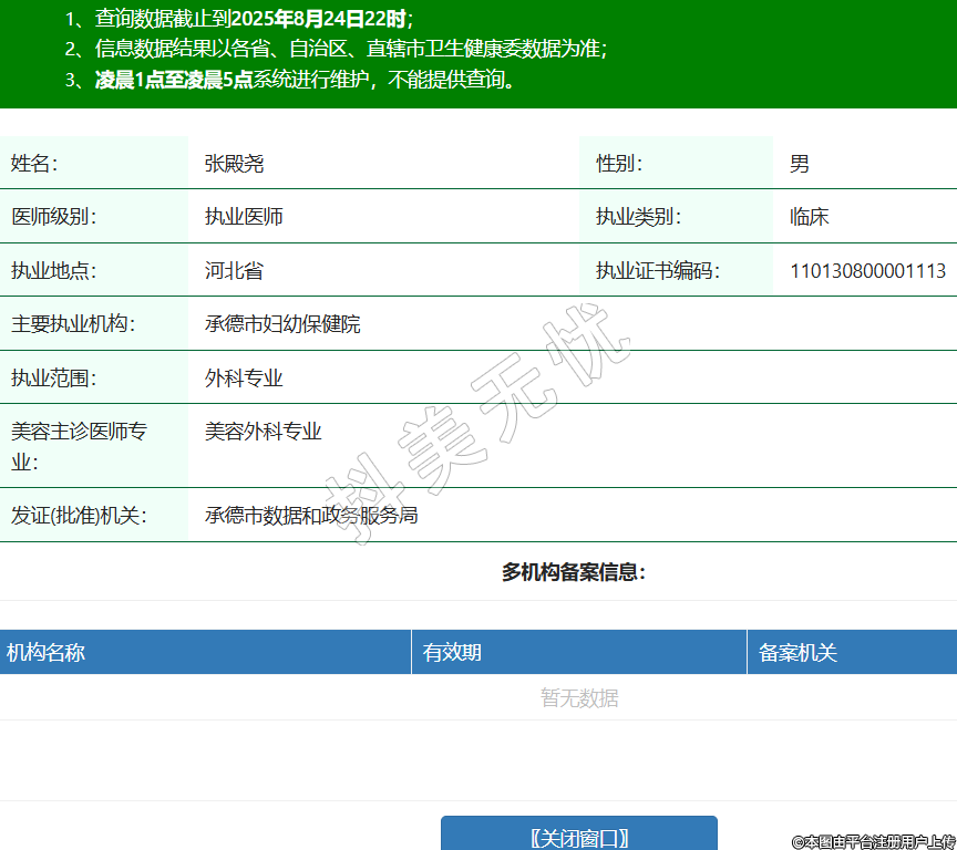 姓名:張殿堯性別:男醫(yī)師級別:執(zhí)業(yè)醫(yī)師執(zhí)業(yè)類別:臨床執(zhí)業(yè)地點:河北省執(zhí)業(yè)證書編碼:110130800001113主要執(zhí)業(yè)機構(gòu):承德市婦幼保健院執(zhí)業(yè)范圍:外科專業(yè)美容主診醫(yī)師專業(yè):美容外科專業(yè)發(fā)證(批準)機關(guān):承德市數(shù)據(jù)和政務(wù)服務(wù)局