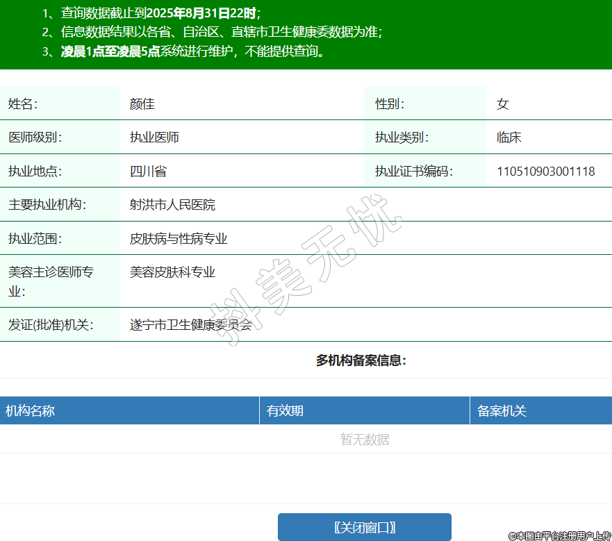 姓名:顏佳性別:女醫(yī)師級別:執(zhí)業(yè)醫(yī)師執(zhí)業(yè)類別:臨床執(zhí)業(yè)地點(diǎn):四川省執(zhí)業(yè)證書編碼:110510903001118主要執(zhí)業(yè)機(jī)構(gòu):射洪市人民醫(yī)院執(zhí)業(yè)范圍:皮膚病與性病專業(yè)美容主診醫(yī)師專業(yè):美容皮膚科專業(yè)發(fā)證(批準(zhǔn))機(jī)關(guān):遂寧市衛(wèi)生健康委員會