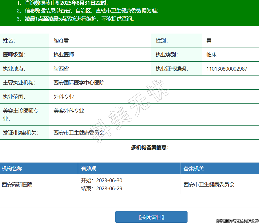 姓名:陶彥君性別:男醫(yī)師級別:執(zhí)業(yè)醫(yī)師執(zhí)業(yè)類別:臨床執(zhí)業(yè)地點:陜西省執(zhí)業(yè)證書編碼:110130800002987主要執(zhí)業(yè)機構(gòu):西安國際醫(yī)學(xué)中心醫(yī)院執(zhí)業(yè)范圍:外科專業(yè)美容主診醫(yī)師專業(yè):美容外科專業(yè)發(fā)證(批準)機關(guān):西安市衛(wèi)生健康委員會多機構(gòu)備案信息: