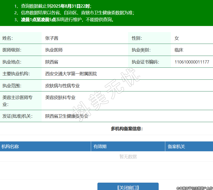 姓名:張子茜性別:女醫(yī)師級別:執(zhí)業(yè)醫(yī)師執(zhí)業(yè)類別:臨床執(zhí)業(yè)地點:陜西省執(zhí)業(yè)證書編碼:110610000011177主要執(zhí)業(yè)機構(gòu):西安交通大學(xué)第一附屬醫(yī)院執(zhí)業(yè)范圍:皮膚病與性病專業(yè)美容主診醫(yī)師專業(yè):美容皮膚科專業(yè)發(fā)證(批準(zhǔn))機關(guān):陜西省衛(wèi)生健康委員會