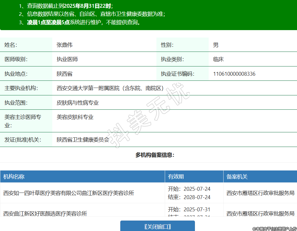 機(jī)構(gòu)名稱 有效期 備案機(jī)關(guān) 西安如一四葉草醫(yī)療美容有限公司曲江新區(qū)醫(yī)療美容診所 開(kāi)始:2025-07-24結(jié)束:2028-07-24西安市雁塔區(qū)行政審批服務(wù)局 西安曲江新區(qū)好醫(yī)顏選醫(yī)療美容診所 開(kāi)始:2025-07-31結(jié)束:2027-07-31西安市雁塔區(qū)行政審批服務(wù)局 -
