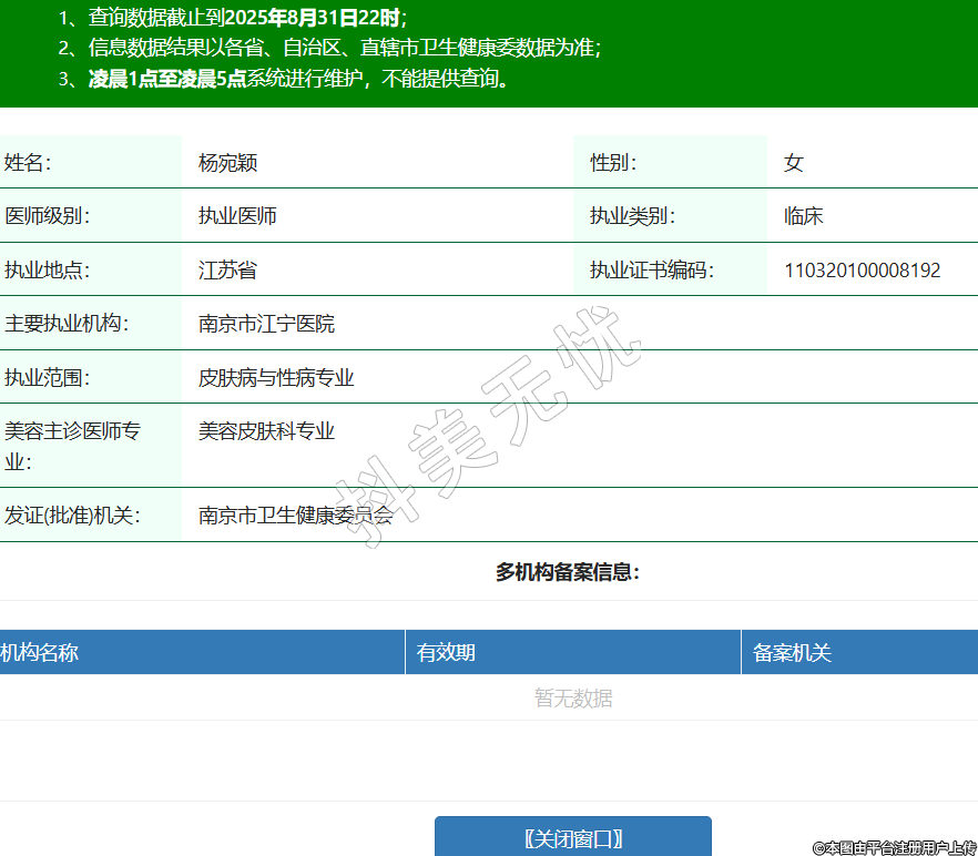 姓名:楊宛穎性別:女醫(yī)師級別:執(zhí)業(yè)醫(yī)師執(zhí)業(yè)類別:臨床執(zhí)業(yè)地點(diǎn):江蘇省執(zhí)業(yè)證書編碼:110320100008192主要執(zhí)業(yè)機(jī)構(gòu):南京市江寧醫(yī)院執(zhí)業(yè)范圍:皮膚病與性病專業(yè)美容主診醫(yī)師專業(yè):美容皮膚科專業(yè)發(fā)證(批準(zhǔn))機(jī)關(guān):南京市衛(wèi)生健康委員會