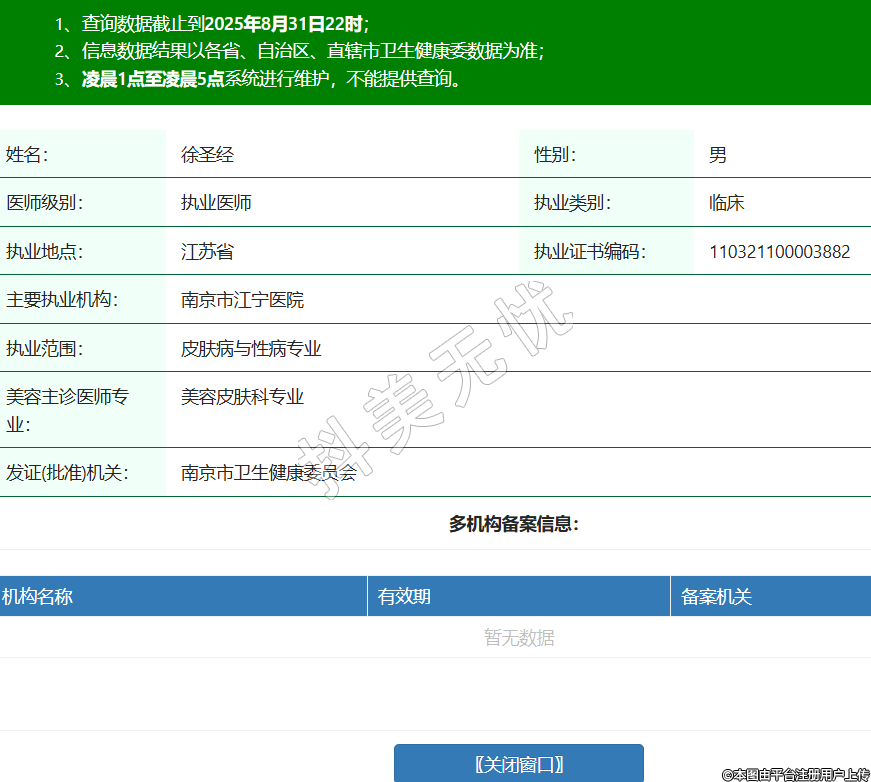 姓名:徐圣經(jīng)性別:男醫(yī)師級別:執(zhí)業(yè)醫(yī)師執(zhí)業(yè)類別:臨床執(zhí)業(yè)地點:江蘇省執(zhí)業(yè)證書編碼:110321100003882主要執(zhí)業(yè)機構(gòu):南京市江寧醫(yī)院執(zhí)業(yè)范圍:皮膚病與性病專業(yè)美容主診醫(yī)師專業(yè):美容皮膚科專業(yè)發(fā)證(批準)機關(guān):南京市衛(wèi)生健康委員會