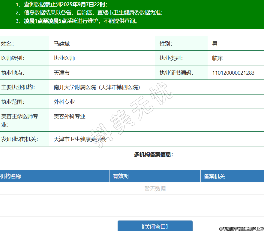姓名:馬建斌性別:男醫(yī)師級別:執(zhí)業(yè)醫(yī)師執(zhí)業(yè)類別:臨床執(zhí)業(yè)地點(diǎn):天津市執(zhí)業(yè)證書編碼:110120000021283主要執(zhí)業(yè)機(jī)構(gòu):南開大學(xué)附屬醫(yī)院(天津市第四醫(yī)院)執(zhí)業(yè)范圍:外科專業(yè)美容主診醫(yī)師專業(yè):美容外科專業(yè)發(fā)證(批準(zhǔn))機(jī)關(guān):天津市衛(wèi)生健康委員會(huì)