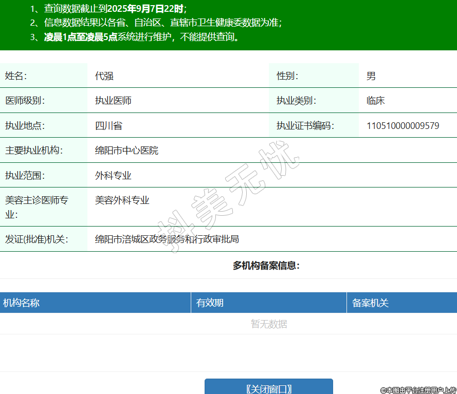 姓名:代強(qiáng)性別:男醫(yī)師級(jí)別:執(zhí)業(yè)醫(yī)師執(zhí)業(yè)類別:臨床執(zhí)業(yè)地點(diǎn):四川省執(zhí)業(yè)證書編碼:110510000009579主要執(zhí)業(yè)機(jī)構(gòu):綿陽(yáng)市中心醫(yī)院執(zhí)業(yè)范圍:外科專業(yè)美容主診醫(yī)師專業(yè):美容外科專業(yè)發(fā)證(批準(zhǔn))機(jī)關(guān):綿陽(yáng)市涪城區(qū)政務(wù)服務(wù)和行政審批局
