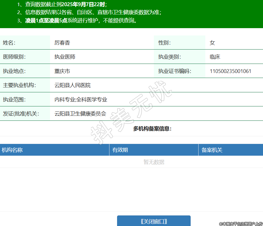 姓名:厲春香性別:女醫(yī)師級別:執(zhí)業(yè)醫(yī)師執(zhí)業(yè)類別:臨床執(zhí)業(yè)地點:重慶市執(zhí)業(yè)證書編碼:110500235001061主要執(zhí)業(yè)機構(gòu):云陽縣人民醫(yī)院執(zhí)業(yè)范圍:內(nèi)科專業(yè);全科醫(yī)學(xué)專業(yè)發(fā)證(批準(zhǔn))機關(guān):云陽縣衛(wèi)生健康委員會
