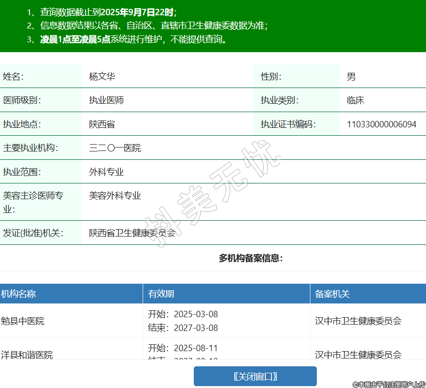 姓名:楊文華性別:男醫(yī)師級別:執(zhí)業(yè)醫(yī)師執(zhí)業(yè)類別:臨床執(zhí)業(yè)地點:陜西省執(zhí)業(yè)證書編碼:110330000006094主要執(zhí)業(yè)機構(gòu):三二〇一醫(yī)院執(zhí)業(yè)范圍:外科專業(yè)美容主診醫(yī)師專業(yè):美容外科專業(yè)發(fā)證(批準)機關:陜西省衛(wèi)生健康委員會多機構(gòu)備案信息: