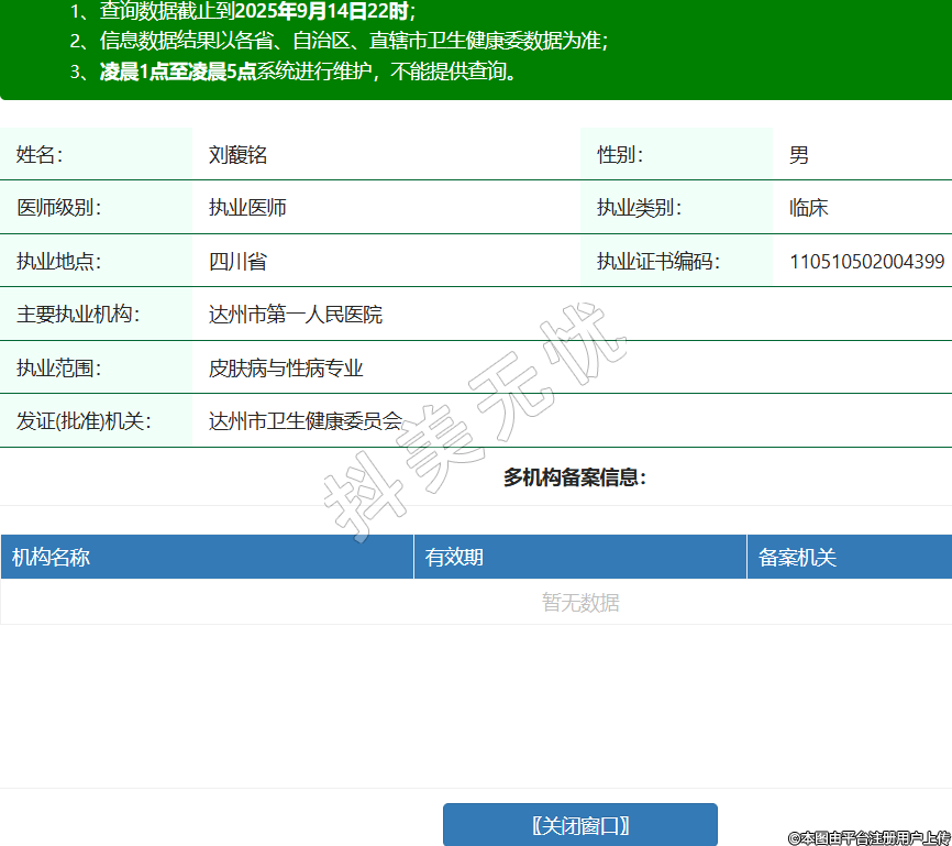 姓名:劉馥銘性別:男醫(yī)師級別:執(zhí)業(yè)醫(yī)師執(zhí)業(yè)類別:臨床執(zhí)業(yè)地點:四川省執(zhí)業(yè)證書編碼:110510502004399主要執(zhí)業(yè)機構(gòu):達州市第一人民醫(yī)院執(zhí)業(yè)范圍:皮膚病與性病專業(yè)發(fā)證(批準)機關(guān):達州市衛(wèi)生健康委員會