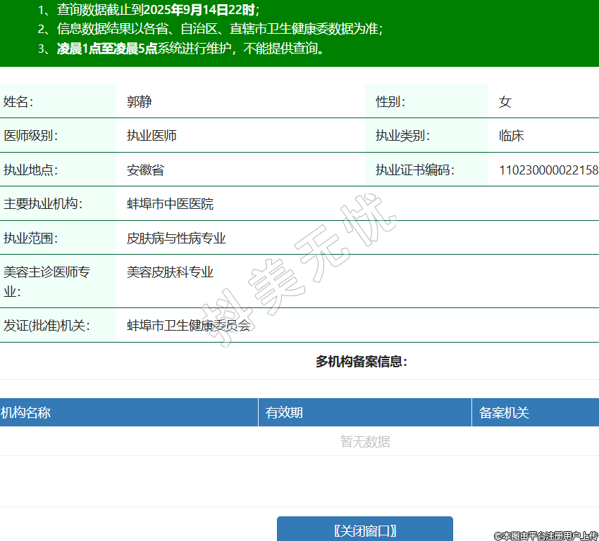 姓名:郭靜性別:女醫(yī)師級別:執(zhí)業(yè)醫(yī)師執(zhí)業(yè)類別:臨床執(zhí)業(yè)地點(diǎn):安徽省執(zhí)業(yè)證書編碼:110230000022158主要執(zhí)業(yè)機(jī)構(gòu):蚌埠市中醫(yī)醫(yī)院執(zhí)業(yè)范圍:皮膚病與性病專業(yè)美容主診醫(yī)師專業(yè):美容皮膚科專業(yè)發(fā)證(批準(zhǔn))機(jī)關(guān):蚌埠市衛(wèi)生健康委員會