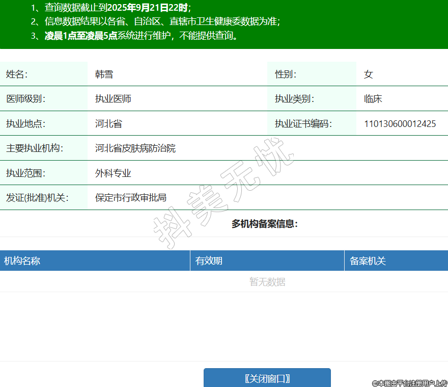 姓名:韓雪性別:女醫(yī)師級別:執(zhí)業(yè)醫(yī)師執(zhí)業(yè)類別:臨床執(zhí)業(yè)地點:河北省執(zhí)業(yè)證書編碼:110130600012425主要執(zhí)業(yè)機構:河北省皮膚病防治院執(zhí)業(yè)范圍:外科專業(yè)發(fā)證(批準)機關:保定市行政審批局