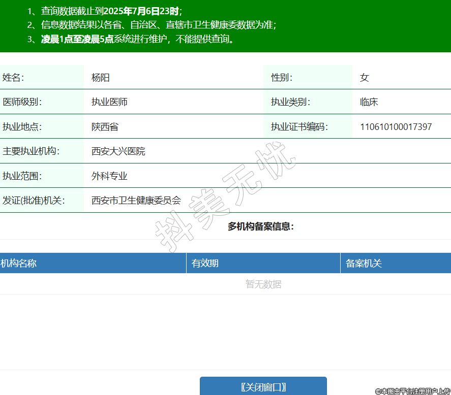 姓名:楊陽性別:女醫(yī)師級別:執(zhí)業(yè)醫(yī)師執(zhí)業(yè)類別:臨床執(zhí)業(yè)地點:陜西省執(zhí)業(yè)證書編碼:110610100017397主要執(zhí)業(yè)機(jī)構(gòu):西安大興醫(yī)院執(zhí)業(yè)范圍:外科專業(yè)發(fā)證(批準(zhǔn))機(jī)關(guān):西安市衛(wèi)生健康委員會