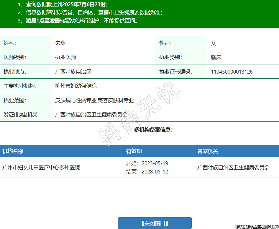 姓名:朱珠性別:女醫(yī)師級(jí)別:執(zhí)業(yè)醫(yī)師執(zhí)業(yè)類(lèi)別:臨床執(zhí)業(yè)地點(diǎn):廣西壯族自治區(qū)執(zhí)業(yè)證書(shū)編碼:110450000013126主要執(zhí)業(yè)機(jī)構(gòu):柳州市婦幼保健院執(zhí)業(yè)范圍:皮膚病與性病專(zhuān)業(yè);美容皮膚科專(zhuān)業(yè)發(fā)證(批準(zhǔn))機(jī)關(guān):廣西壯族自治區(qū)衛(wèi)生健康委員會(huì)多機(jī)構(gòu)備案信息: