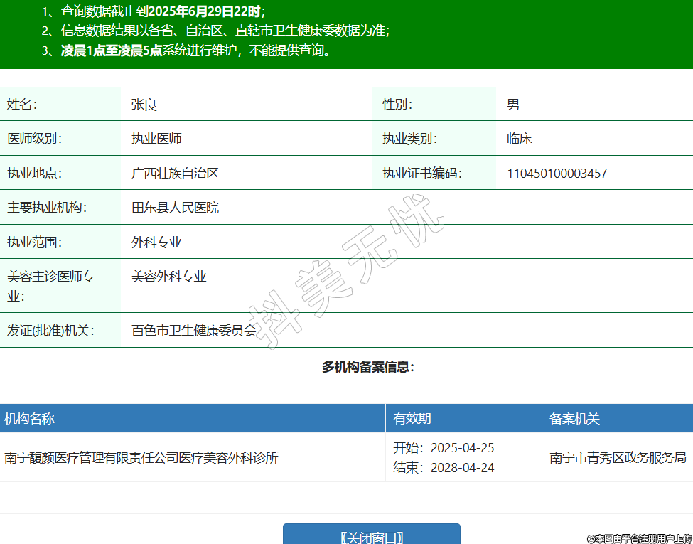 機(jī)構(gòu)名稱 有效期 備案機(jī)關(guān) 南寧馥顏醫(yī)療管理有限責(zé)任公司醫(yī)療美容外科診所 開始:2025-04-25結(jié)束:2028-04-24南寧市青秀區(qū)政務(wù)服務(wù)局 -