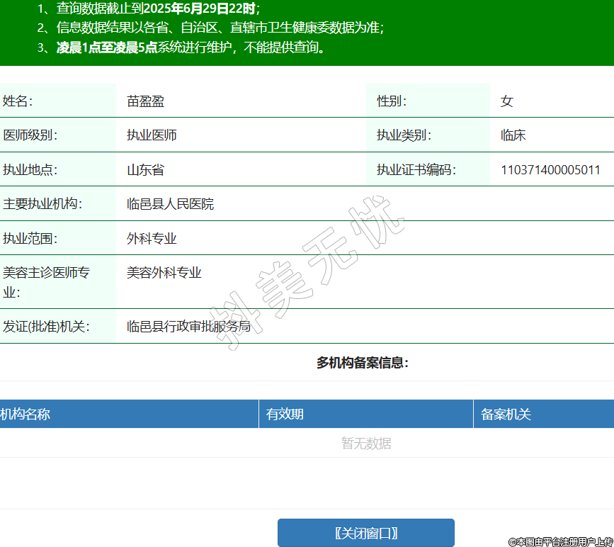 姓名:苗盈盈性別:女醫(yī)師級別:執(zhí)業(yè)醫(yī)師執(zhí)業(yè)類別:臨床執(zhí)業(yè)地點:山東省執(zhí)業(yè)證書編碼:110371400005011主要執(zhí)業(yè)機構(gòu):臨邑縣人民醫(yī)院執(zhí)業(yè)范圍:外科專業(yè)美容主診醫(yī)師專業(yè):美容外科專業(yè)發(fā)證(批準(zhǔn))機關(guān):臨邑縣行政審批服務(wù)局