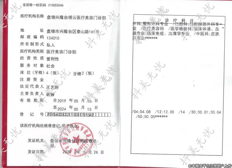 醫(yī)療機(jī)構(gòu)名稱:盤錦興隆臺(tái)琇云醫(yī)療美容門診部