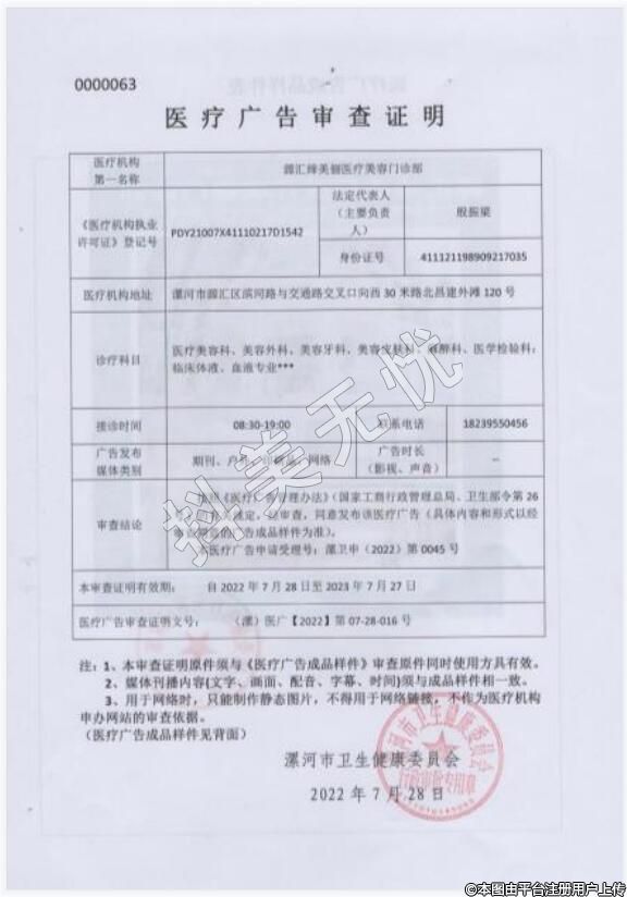 診療科目:醫(yī)療美容科;美容外科;美容牙科;美容皮膚科/麻醉科/醫(yī)學(xué)檢驗科;臨床體液、血液專業(yè)******