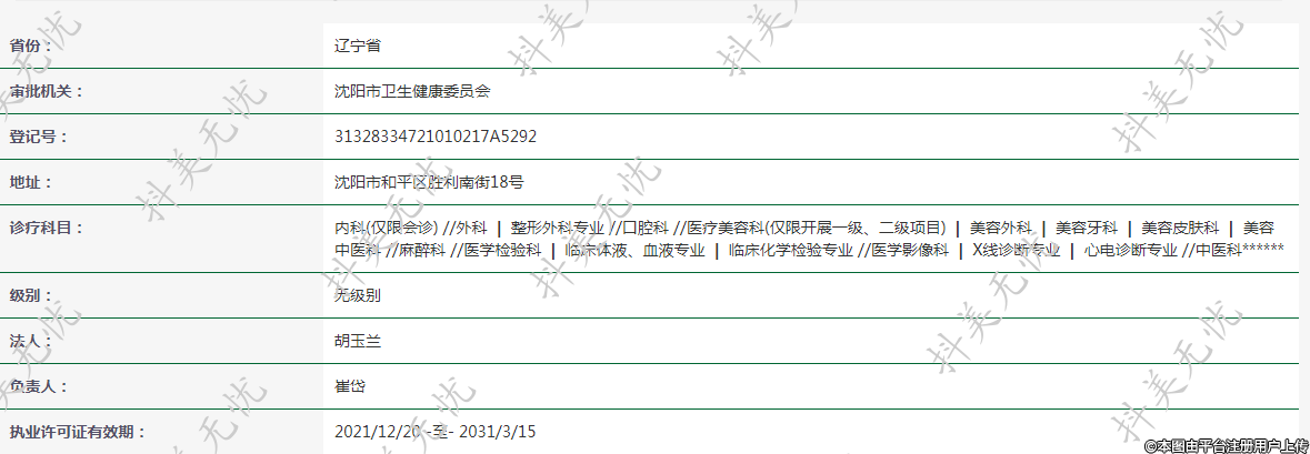 診療科目: 內科(僅限會診) //外科 | 整形外科專業(yè) //口腔科 //醫(yī)療美容科(僅限開展一級、二級項目) | 美容外科 | 美容牙科 | 美容皮膚科 | 美容中醫(yī)科 //麻醉科 //醫(yī)學檢驗科 | 臨床體液、血液專業(yè) | 臨床化學檢驗專業(yè) //醫(yī)學影像科 | X線診斷專業(yè) | 心電診斷專業(yè) //中醫(yī)科******
