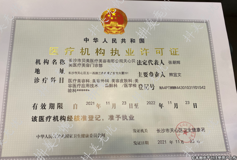 機構(gòu)名稱:長沙市貝美醫(yī)療美容有限公司天心貝美醫(yī)療美容門診部。