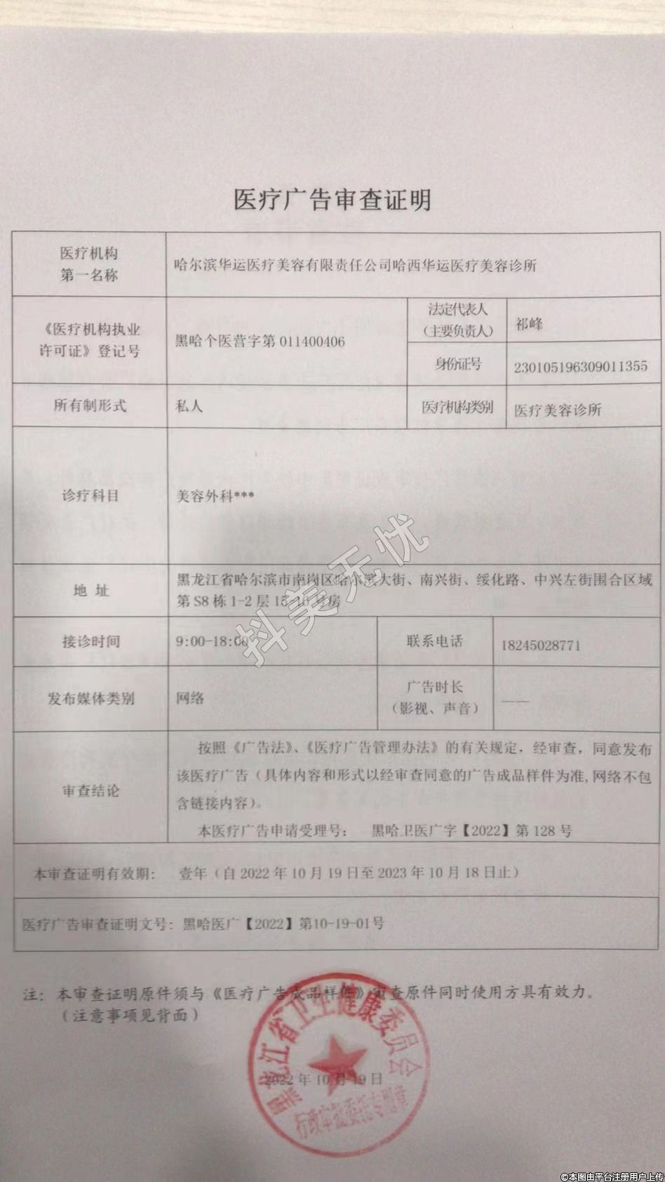機(jī)構(gòu)名稱:哈爾濱華運(yùn)醫(yī)療美容有限責(zé)任公司哈西華運(yùn)醫(yī)療美容診所