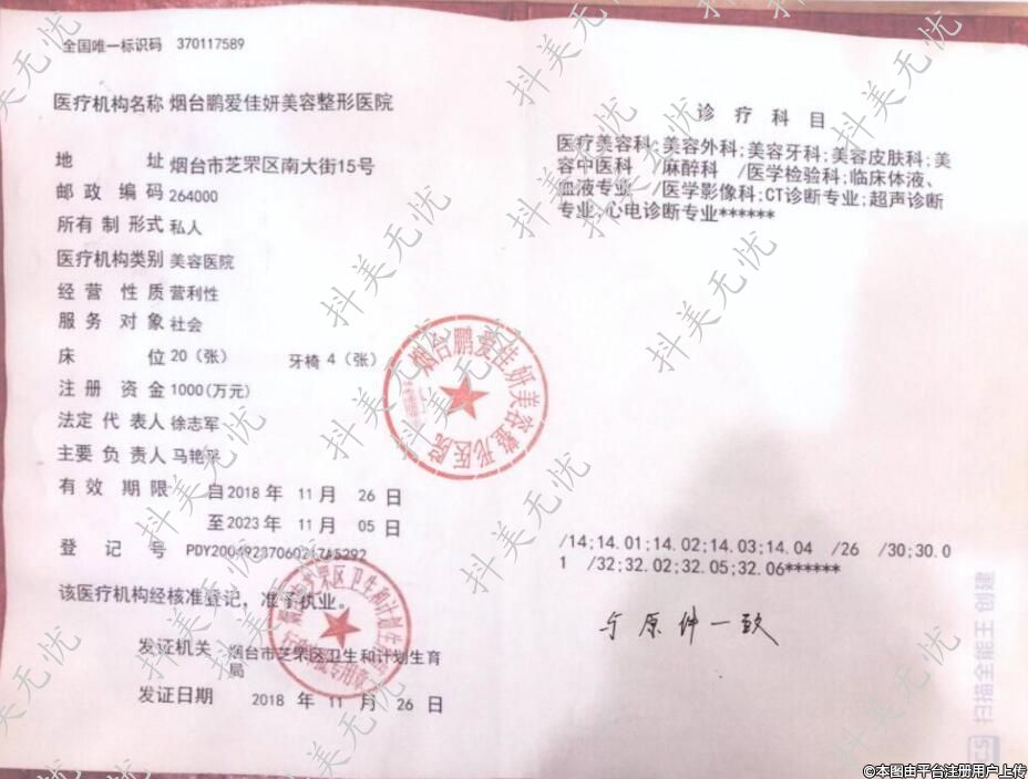 醫(yī)療機(jī)構(gòu)名稱:煙臺鵬愛佳妍美容整形醫(yī)院