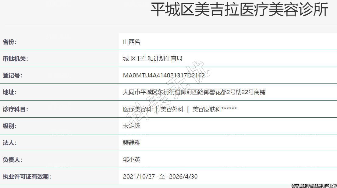 大同美吉拉醫(yī)療美容成立于2021-06-01,地址:大同市平城區(qū)東街街道御河西路御馨花都2號樓22號商鋪,診療科目:醫(yī)療美容科 | 美容外科 | 美容皮膚科******