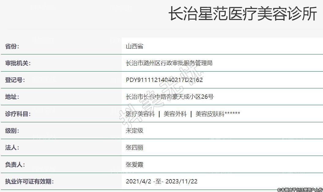 長治星范醫(yī)療美容成立于2018-06-04,地址:長治市長興中路帝豪天成小區(qū)26號(hào),診療科目:醫(yī)療美容科 | 美容外科 | 美容皮膚科******