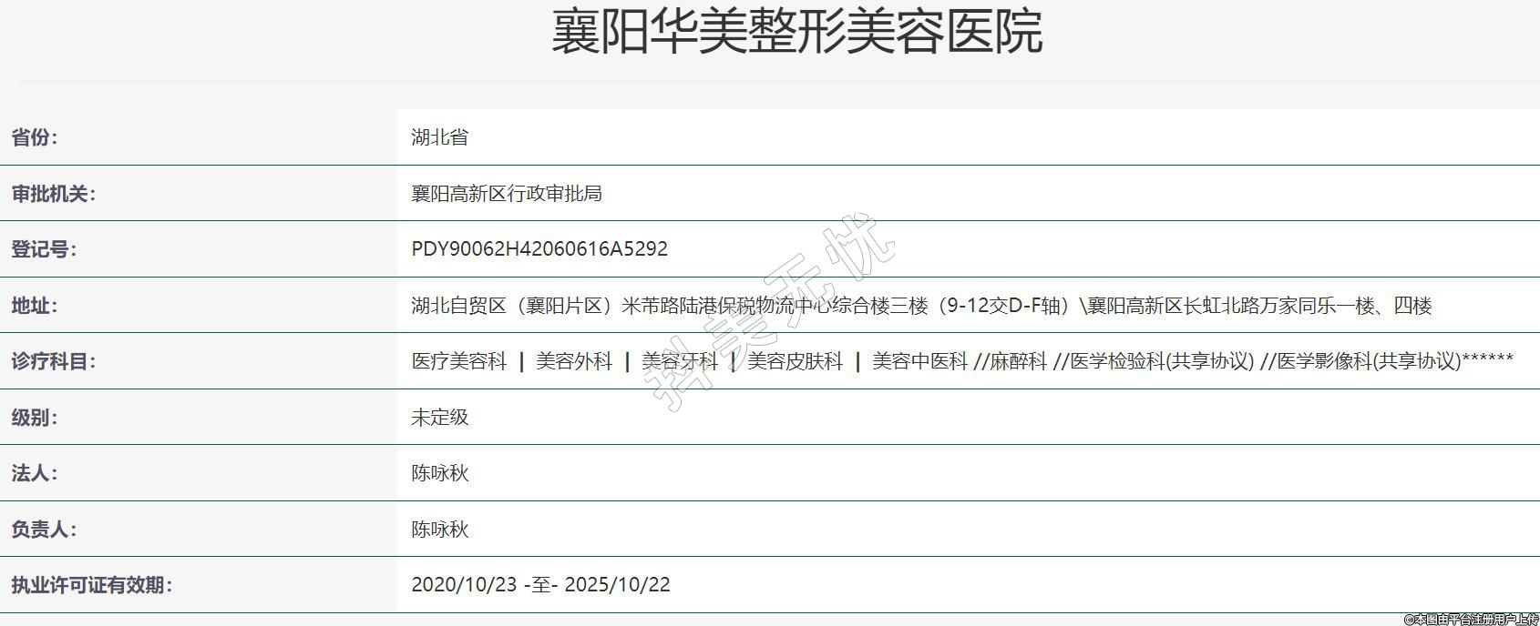 襄陽華美整形美容診療科目:醫(yī)療美容科 | 美容外科 | 美容牙科 | 美容皮膚科 | 美容中醫(yī)科 //麻醉科 //醫(yī)學檢驗科(共享協(xié)議) //醫(yī)學影像科(共享協(xié)議)******
