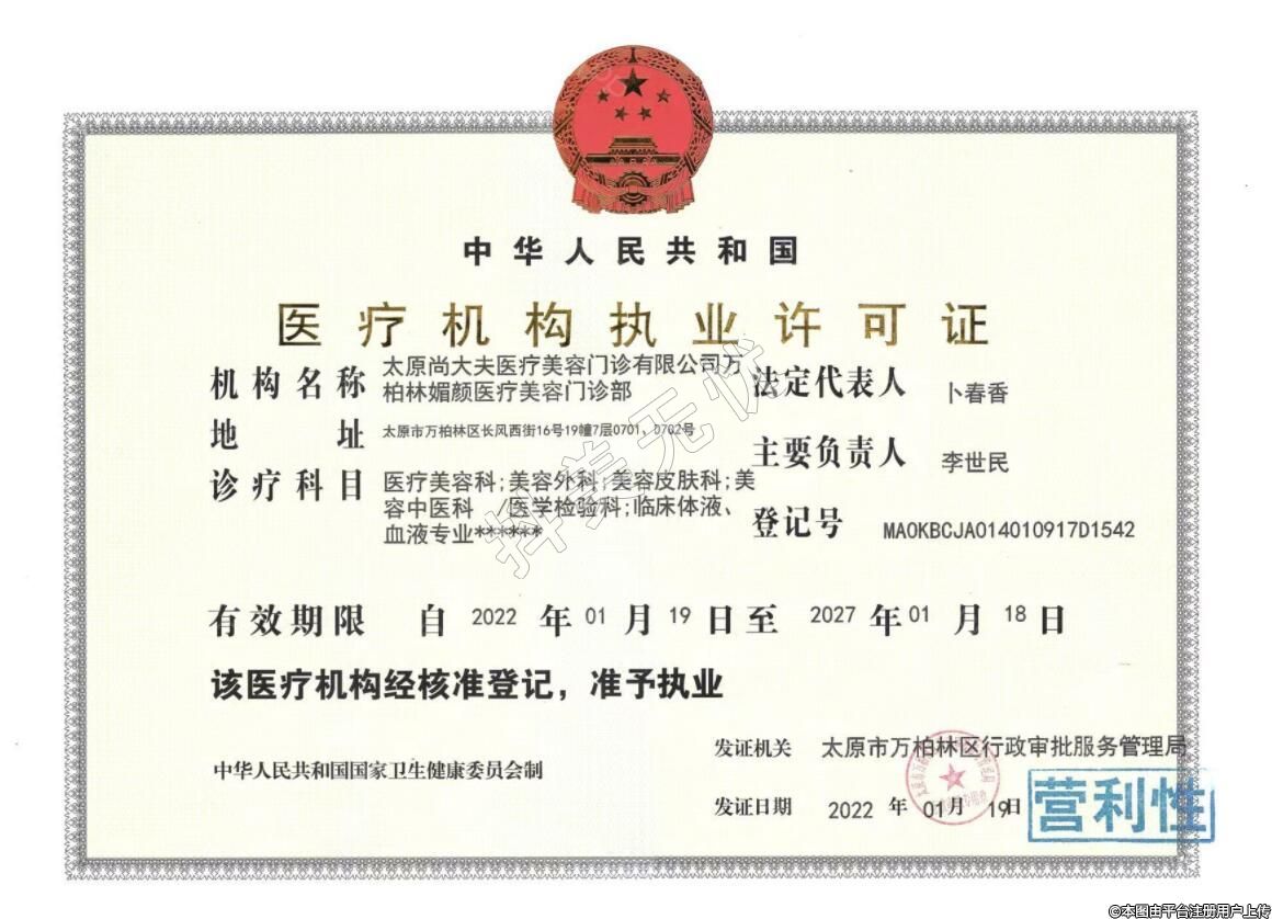 機(jī)構(gòu)名稱:太原尚大天醫(yī)療美容門診部有限公司萬柏林媚顏醫(yī)療美容門診部