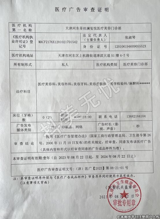 天津河?xùn)|菲絲瀾璽悅醫(yī)療美容2016-11-07成立,地址:天津市河?xùn)|區(qū)津?yàn)I大道51增5、6號(hào),診療科目:醫(yī)療美容科;美容外科;美容牙科;美容皮膚科/麻醉科/醫(yī)學(xué)檢驗(yàn)科******