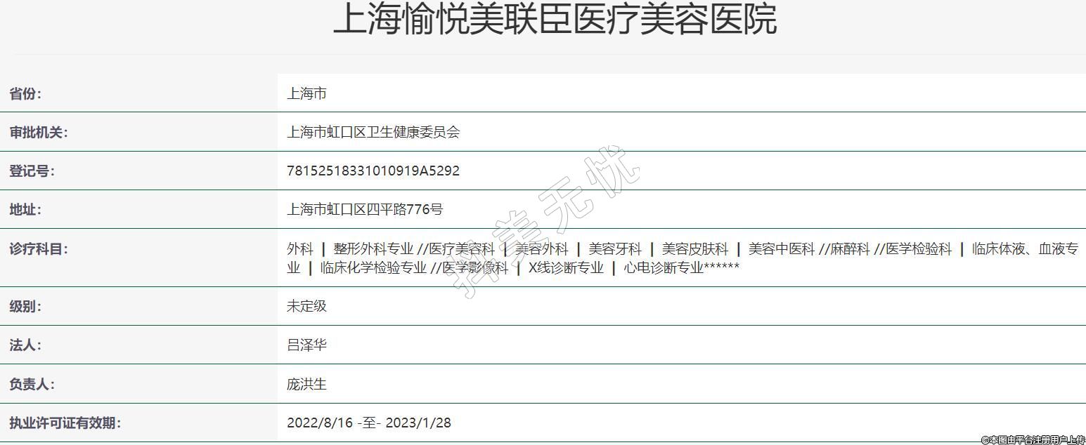 上海愉悅美聯(lián)臣醫(yī)療美容2005-10-14成立,診療科目:外科 | 整形外科專業(yè) //醫(yī)療美容科 | 美容外科 | 美容牙科 | 美容皮膚科 | 美容中醫(yī)科 //麻醉科 //醫(yī)學檢驗科 | 臨床體液、血液專業(yè) | 臨床化學檢驗專業(yè) //醫(yī)學影像科 | X線診斷專業(yè) | 心電診斷專業(yè)******