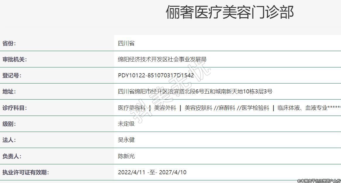 綿陽儷奢醫(yī)療美容2021年09月09日,地址:四川省綿陽市經開區(qū)涪濱路北段6號五和城南新天地10棟3層3號,診療科目:醫(yī)療美容科 | 美容外科 | 美容皮膚科 //麻醉科 //醫(yī)學檢驗科 | 臨床體液、血液專業(yè)******