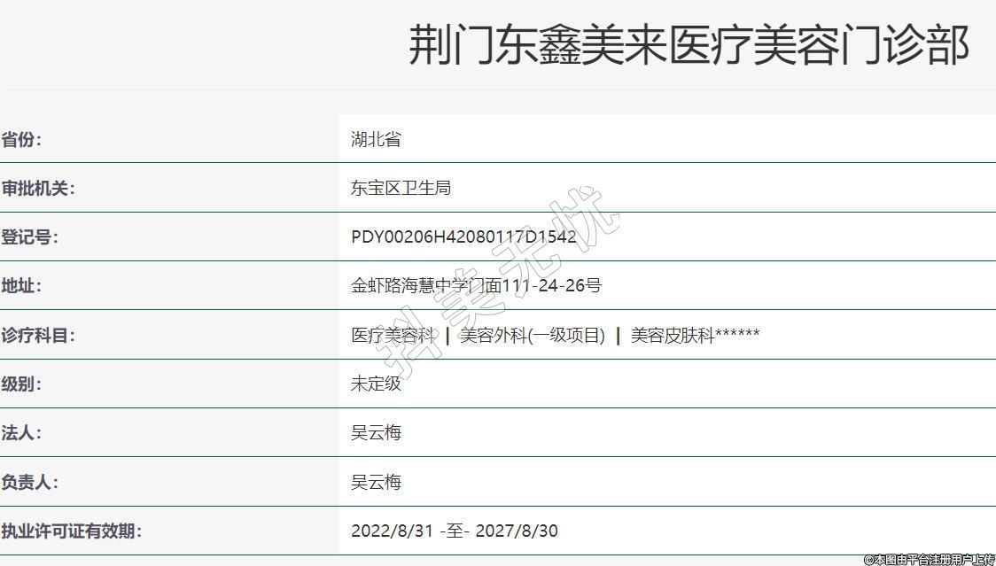 荊門東鑫美來醫(yī)療美容2001年12月13日成立,地址:金蝦路?;壑袑W門面111-24-26號,診療科目:醫(yī)療美容科 | 美容外科(一級項目) | 美容皮膚科******