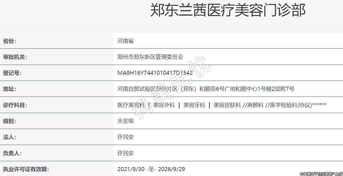 鄭州蘭茜醫(yī)療美容2017年01月22日成立,地址:河南自貿試驗區(qū)鄭州片區(qū)(鄭東)和順街6號廣地和順中心1號樓2層附7號,診療科目:醫(yī)療美容科 | 美容外科 | 美容牙科 | 美容皮膚科 //麻醉科 //醫(yī)學檢驗科(協(xié)議)******